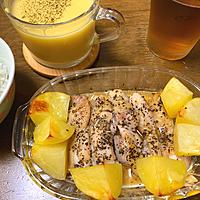 塩、黒胡椒、バジル、倍量にしたら味付けちょうど良かったです。切った状態で器に盛って210度25分でいい感じになりました。ジャガイモにも塩ちょっとかけました!肉汁すごくてお肉もジャガイモも美味しかったです!