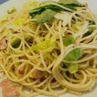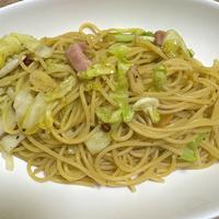 - 4 薄切りロングベーコンに火が通ったらキャベツを加えて更に炒め、キャベツが少ししんなりしてきたところにスパゲティと茹で汁、アンチョビソース、ブラックペッパーを加えて手早く絡ませます。