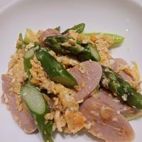 魚肉ソーセージを使った懐かしい味わいのおかずです。卵とマヨネーズで炒めることで、コクのある美味しさに仕上がります。アスパラを加えると彩りも良く、お弁当のおかずにぴったり。子供がバクバクと食べてくれる人気メニューで、買い置きの食材だけで手軽に作れるのも魅力です。マヨネーズで炒める際は焦げやすいので、弱火で優しく炒めるのがポイントです。