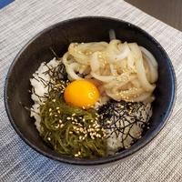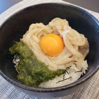 - 4 丼鉢にごはんをよそい、刻みのりをかけ、2を盛り付けます。3をかけ、真ん中に卵黄を乗せて完成です。