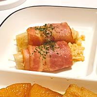 - 3 薄切りロングベーコンに2をのせ、きつく巻きます。