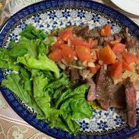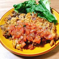 サーロインを揚げました。トマトと玉ねぎのソースが油分をサッパリさせてくれます。爽やかなソースをたっぷりかけて食べると最高です!