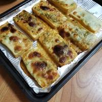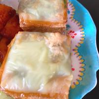 - 4 アルミホイルを敷いた天板に2をのせ、3を塗り、チーズをのせます。オーブントースターでチーズに焼き色がつくまで5分焼いたら完成です。