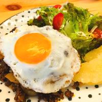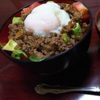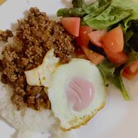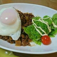 ボリューム満点ロコモコ風ごはんはいかがでしょうか。ハンバーグを作らず、そぼろ風に仕上げてごはんにかけました。目玉焼きや付合わせのサラダと一緒に食べると、まさにロコモコ丼になります。ぜひ、お試し下さい。