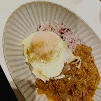 - 5 お皿の半分に付合わせを盛り、手前にごはんを盛りつけます。ごはんに4をかけ、目玉焼きをのせ、完成です。