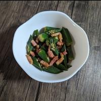 オクラとベーコンを組み合わせて、バター醤油で炒めてみました。オクラの歯応えとベーコンの旨味が、バター醤油とよく合います。しっかりとした味付けですので、お酒にもよく合う一品です。ぜひお試しくださいね。