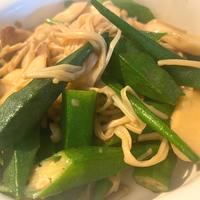 残りもののマッシュルームも薄切りにして加えてみました。オクラが固かったので、2分ほど蓋をして蒸し焼きにし、柔らかくしました。