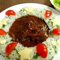 イブのメニューに🎄牛肉は薄切り肉を使いました。シチュー調理は息子が、飾り付けは娘が、私はパセリライスを担当しました。とても美味しかったです☆😃✨🍴