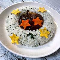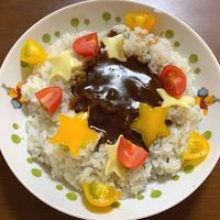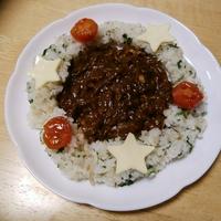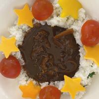 - 7 パセリライスをつくります。トマトのヘタをとり2等分にします。スライスチェダーチーズと黄パプリカを星型に切り抜きます。