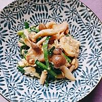 しめじも入れました。後入れのたまごでオイスターソースがよくからんで美味しかったです。豚バラは油を使わずによく炒めました。