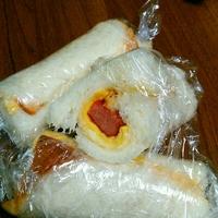 - 5 1にスライスチーズと3と4をのせて挟み、半分に切って出来上がりです。