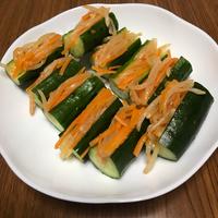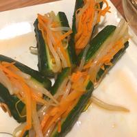 ビールのおともにぴったり!オイキムチ風に仕上げた、きゅうりが主役のおつまみです。にんじんと豆もやしのナムルを挟んで彩りの綺麗な一品です。とっても簡単なので、家飲みの気軽なおつまみとしてぜひ作ってみてくださいね。