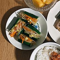 きゅうりに切り込みを入れるところでスパッと割れてしまい、何本か失敗…。最初に深めに切り込みを入れて優しく裂く感じにしたら、上手く具材をサンドできました。