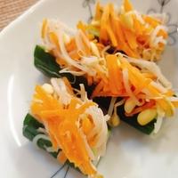 - 3 にんじんは千切りにし、豆もやしと一緒にボウルに入れてごま油を絡めてラップをかけて、600Wのレンジで3分加熱します。