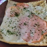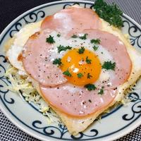 - 2 フライパンを中火で熱し、1の断面を上にして敷き、ピザ用チーズ、ハム、卵の順にのせます。蓋をして4分程蒸し焼きにし、白身が固まったら(A)をかけ、火から下ろします。