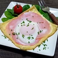 カリカリ油揚げのガレット風はいかがですか。カリカリに焼いた油揚げに、ハムの塩気ととろ〜りチーズ、卵の黄身を崩しながら食べると、とっても美味しいですよ。小麦粉やそば粉で作るより糖質も控えられますよ。ぜひお試しください。