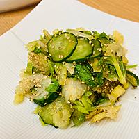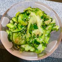 セロリの変わった食べ方がしたくて作りましたが、きゅうりから水分がでるからか薄くなりました。(塩で水分出して絞ったけど)塩分を足して食べた。