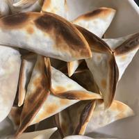 - 5 シュウマイの皮にスプーンで4をおき、三角に折り、端に水をつけてしっかりとくっつけます。