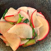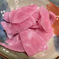 自作の紅芯大根が沢山採れたので、スライサーでスライスして常備菜にしています。パリパリ食感がたまりません。酢の効果で多少日持ちもし、お弁当の箸休めにも良いです。