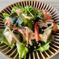 豆腐とカニカマの中華風サラダのご紹介です。豆腐とカニカマの旨味に、ごま油の風味が効いたドレッシングとよく合います。わかめも加えていますので、ボリュームのある一品に仕上がってます。ぜひお試しくださいね。