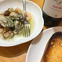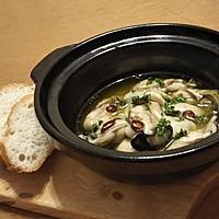 スキレットがないので、お一人様用のお鍋があったので最後に移しました。火を通しすぎると身が小さくなりがちなので、短時間で仕上げました。牡蠣がふっくらぷりぷりでおいしかったです。😋🍴💕 ~バケットを添えて~