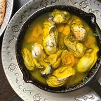 牡蠣のアヒージョのご紹介です。プリプリとした食感でミルキーな味わいの牡蠣、たっぷりのオリーブオイルにニンニクが香りとてもおいしいですよ。フランスパンやクラッカーを添えてもおいしいです。お酒のおつまみにもぴったりです。