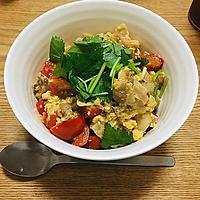 - 7 器にごはんを盛り付け、6をのせます。三つ葉をのせて完成です。