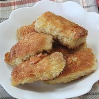 - 5 フライパンの底から1cm程の高さまで揚げ油を注ぎ、170℃に熱し、4を入れます。返しながら5分程揚げ、両面がきつね色になり、中に火が通ったら油を切ります。