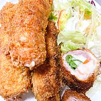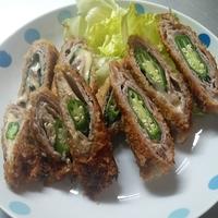 美味しいので大葉も一緒に巻いて何度も作成。チェダーチーズにするとコッテリで不評。うちは普通のスライスチーズ。