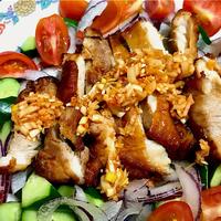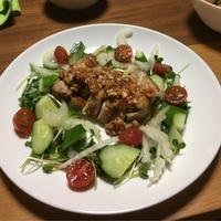 - 5 肉を食べやすく細切りにして、皿の野菜の上にのせ、ミニトマトを散らして、最後に1をまわしかけたらできあがりです