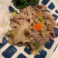 - 2 フライパンにごま油、すりおろし生姜を入れて中火で加熱します。香りが立ったら豚こま切れ肉を入れて色が変わるまで炒め、1を加えます。