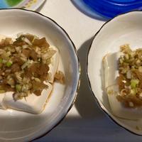 - 4 2を豆腐の上にのせ、お好みで万能葱やラー油をかけます。