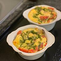 - 5 耐熱皿に1、4を入れて、180℃のオーブンで15〜20分焼きます。竹串を刺したときに卵液が付かなくなったらパセリをのせて完成です。