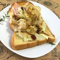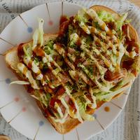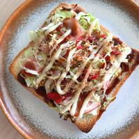 お好み焼き風食パンいかがでしょうか。見た目も味もまるでお好み焼きのような一品です。食べ応えがあるので、朝食などにもおすすめですよ。お好みで紅生姜をのせると、より本格的な味わいが楽しめますよ。ぜひお試しくださいね。
