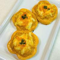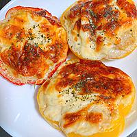 - 4 アルミホイルを敷いたオーブントースターの天板に3を乗せ、2を詰め、ピザ用チーズを乗せ、オーブントースターで火が通るまで15分程度焼きます。