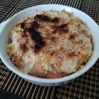 マカロニを茹でる時間を少し短くして、ホワイトソースと絡めてオーブンで焼いた方が美味しそうだと思った!味付けはとても良かった◎