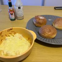 コンソメの代わりに野菜だし・玉ねぎ麹・白ワイン使用、ペンネはソースの鍋に入れて混ぜ込んでから耐熱皿へ。粉チーズとパン粉追加。