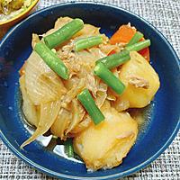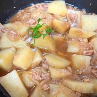 野菜スープ煮のツナ缶、新玉ねぎ大1個、新じゃが、人参もプラス♪お水の量を減らしたら調味料はレシピ通りでもしっかり味がついて美味しかったです。お肉よりも好みかも・・。また作ります🎶