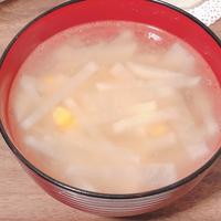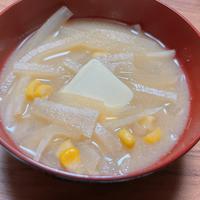 - 2 鍋に水、1、顆粒和風だしを入れて大根がやわらかくなるまで、5分程中火で加熱します。コーンを加えて、みそを溶かし入れ火から下ろします。