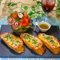 香ばしいハード系のカンパーニュパンを使用した、きのこ入りの明太子チーズトーストです。ブラウンマッシュルームの旨味がじゅわっと口の中に広がり、明太子とチーズの塩気とよく合い、くせになるおいしさです。ワインなどお酒のおつまみにもオススメですよ。ぜひ、お試しください。