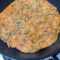 ひっくり返すのに失敗して少し汚くなってしまいましたが、味はとっっても美味しいです😌次は小さめのフライパンで作ってみようと思います。大きいとひっくり返すのが大変なので(^◇^;)