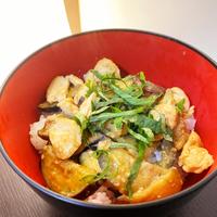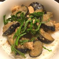 すりごまとごま油の香ばしさにまろやかなみそを合わせた、こってりとしたナスのごまみそ炒めです。おかずとしていただくのはもちろんおすすめなのですが、ごはんとの相性が抜群なので丼にしてみました。トッピングの大葉もマストです!
