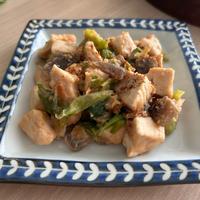 - 5 鶏むね肉に火が通ったら、2と(A)と輪切り唐辛子を入れて中火で炒め、器に盛り付けて出来上がりです。