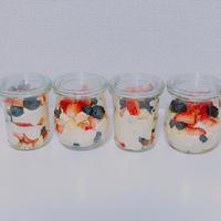 - 8 グラスに1、5mm角に切った2、ブルーベリー、7の順に重ね、同様に2回くり返します。