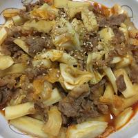 - 4 フライパンにごま油をひき、中火で熱して香りがたったら牛バラ肉を入れ、肉の色が変わってきたらキャベツを加え、キャベツがしんなりするまで炒めます。