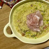 ベーコンを鶏肉、水・牛乳を100・150。最初に刻みニンニクを入れる。もう少し水分少なくても良い