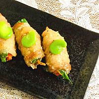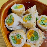出来上がったタレだけ味見したら滅茶苦茶塩っぱくて失敗だーと思ったけど、食べてみたら実際はとても美味しかったです。口当たり良く食べたかったのでたべれぽ参考にしてにんじんとインゲンは予め茹でてから巻きました。季節柄、空豆乗せました。
