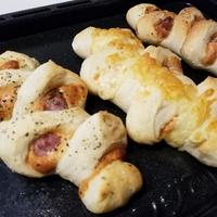 - 5 3を麺棒で縦15cm横5cmに伸ばし、4を塗って端から巻き、綴じ目をしっかりと閉じます。天板に並べてオーブンの発酵機能を使って35℃で15分、2倍の大きさになるまで二次発酵します。