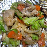 - 5 中火で熱したフライパンにサラダ油をひき、2、3を入れ、炒めます。鶏もも肉の色が変わったら、1を入れ炒めます。