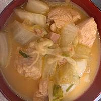 - 3 鍋に白菜と鶏むね肉をミルフィーユ状にしてならべ、1を入れて中火で沸騰させます。